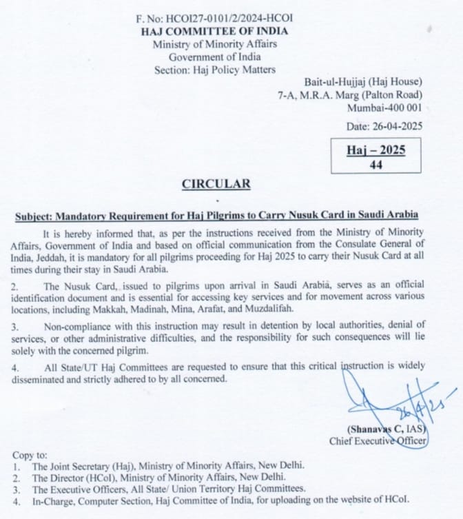 હજ કમિટી ઓફ ઈન્ડિયા તરફથી માહિતી આપવામાં આવે છે કે, ભારત સરકારના માઇનોરીટી મંત્રાલય અને ભારતીય દૂતાવાસ, જિદ્દાહ તરફથી મળેલા નિર્દેશો અનુસાર, હજ 2025 માટે જતા દરેક યાત્રીઓ માટે પોતાના સાથે “નુસુક કાર્ડ” રાખવું ફરજિયાત છે.